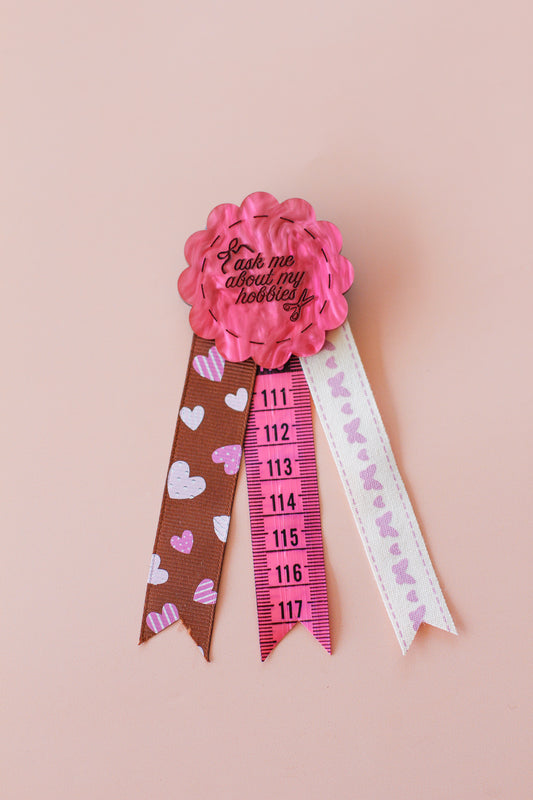 ask me about my hobbies rosette badge